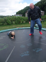 Photos (belated as usual!) from a recent visit from Grandad Music (a.k.a.Stephs dad) this July. Grandad Music drove all the way from Norfolk in his converted van. When Grandad told Curtis he had a fridge and sink in his van Curtis thought this was a very funny story, then was very excited when he found he wasn't joking after all. During the week we took a trip to Almond Valley Heritage Centre where Curtis, Grandad and Steph did a spot of trampolining which gave Curtis the giggles, and finally at lunch Curtis did his Charlie Chaplin impersonation with the help of a rather large chocolate cornetto. The last photo shows his very own take on bob the builder. I could not stop laughing when Curtis ran in the room like this announcing...'mummy look I'm bob!' Genius work on the nappy toolbelt Curtis.